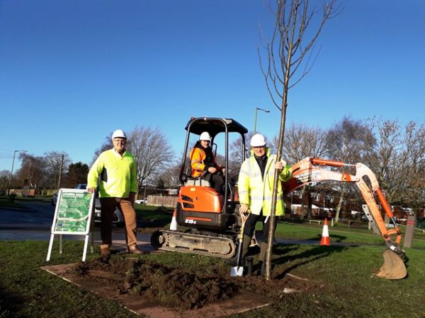 Picture shows Cllr Ken Hawkins, George Biba from contractors idverde and Cllr Ian Courts planting a rowan tree in Green Lane.